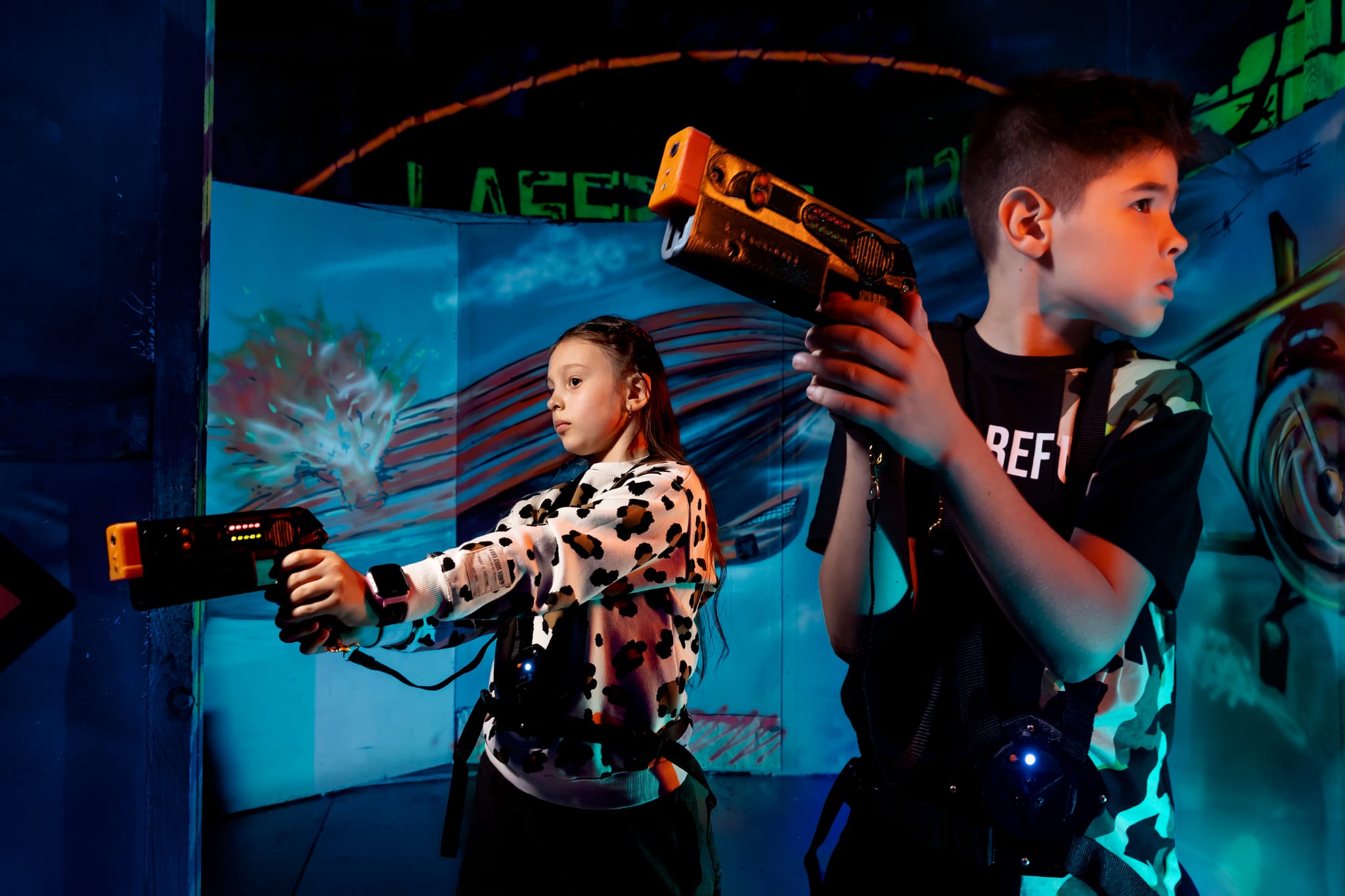 Descopera o experienta de jocuri futurista in care viata si munitia sunt afisate cu ajutorul LED-urilor. Atunci cand ramai fara munitie, arma iti va atrage atentia si va trebui sa apesi butonul de reincarcare pentru a-ti alimenta din nou arma.